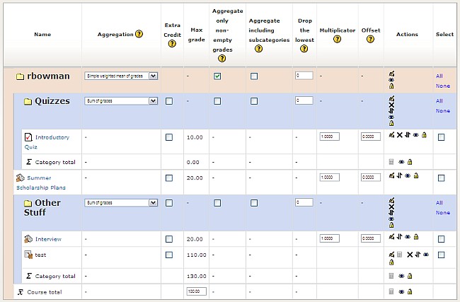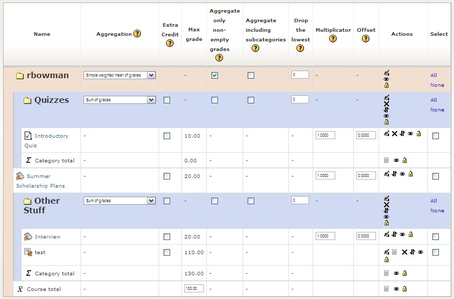Showing grade categories and items in "Full view" presents just about any editing option that an instructor may wish to have. These options are activated through clicking on icons. The icons are the usual ones seen when editing is turned on in the main course page. These include the edit, delete, hide, move and lock icons for each category and item which the instructor has added to the grade report. Grade items that were added by an assignment can be edited here, but to delete any such grade item, one must go back to the main course page and delete the assignment there. Figure 3 shows a screenshot of the "Full view" for a sample course.
