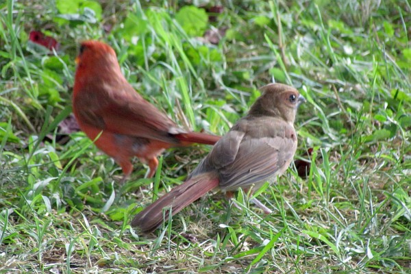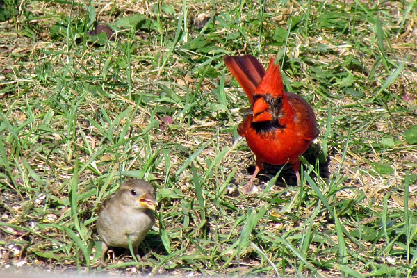 A Female House Sparrow and Male Cardinal Both Hunt for Food (5-Aug-15; © Richard L. Bowman)