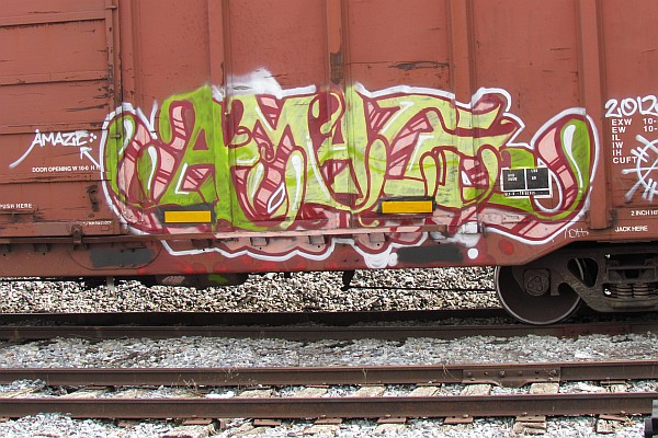 A Close-up of the Right-hand End of a Graffiti-painted Boxcar, Harrisonburg, VA, USA (15-Oct-13; © Richard L. Bowman)